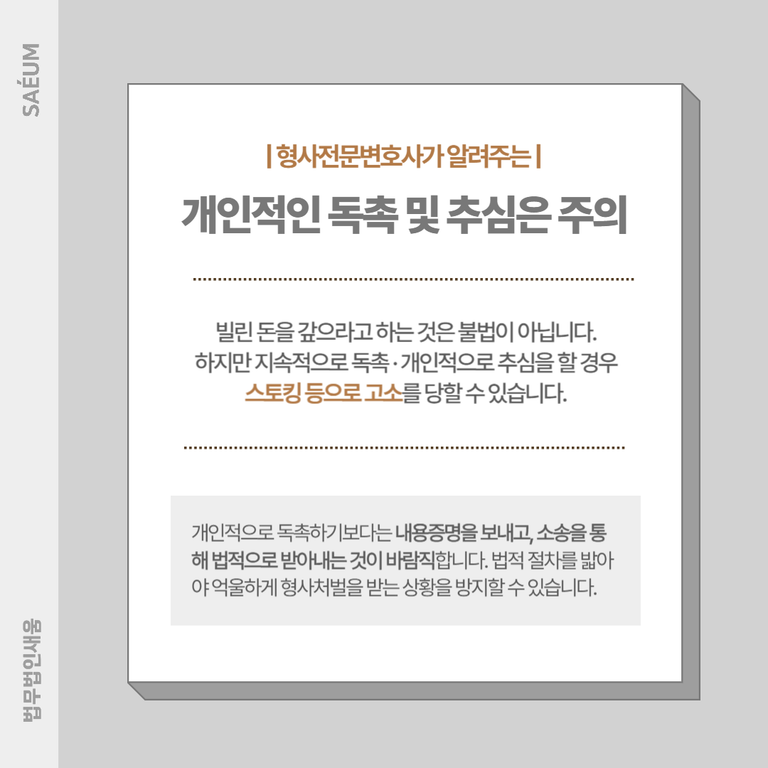 계속해서 연락을 하거나 찾아가는 등의 행위는 상대방에게 ‘스토킹’으로 고소당할 수도 있기 때문에 각별한 주의가 필요합니다. 따라서 개인적으로 독촉하기보다는 내용증명을 보내고, 소송을 통해 법적으로 받아내는 것이 바람직합니다. 이렇게 법적인 절차를 밟아야 억울하게 형사처벌을 받는 상황을 방지할 수 있습니다.