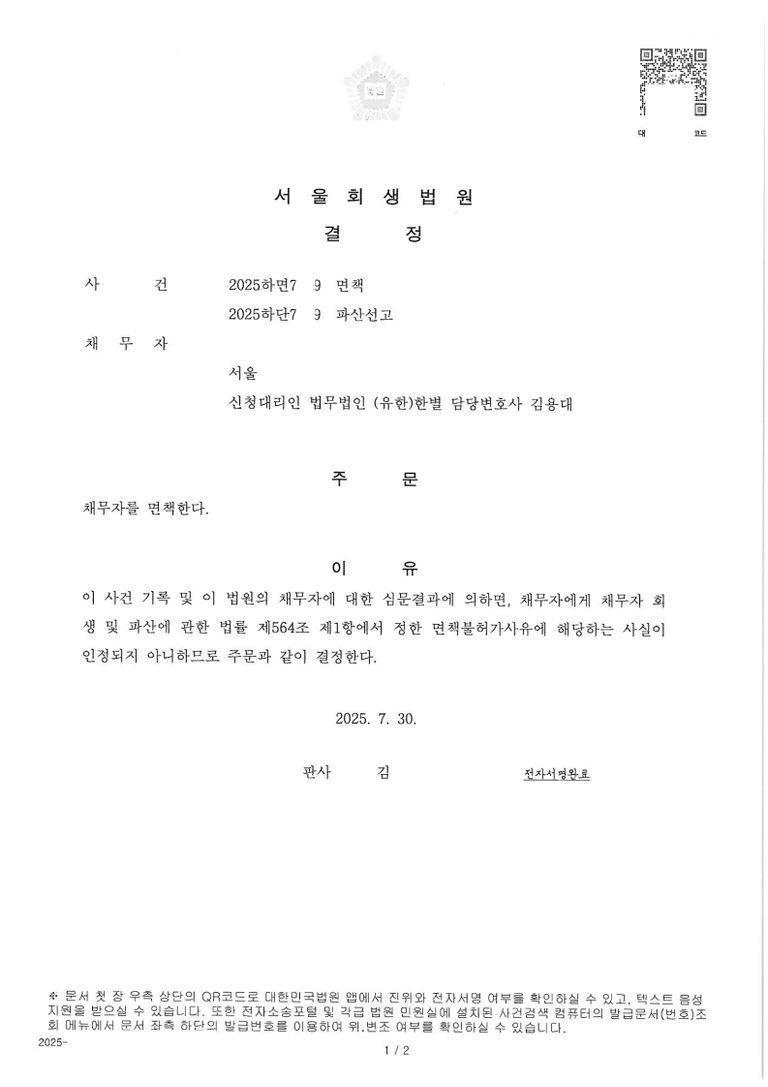 신청시 증빙자료도 충분히 제출되어 파산관재인 면담시 별도 추가 자료 요청없이 면담 후 1차 채권자집회기일에 면책결정을 받음으로서 "두달 반"만에 굉장히 빠르게 면책결정을 받게 된 사건입니다.