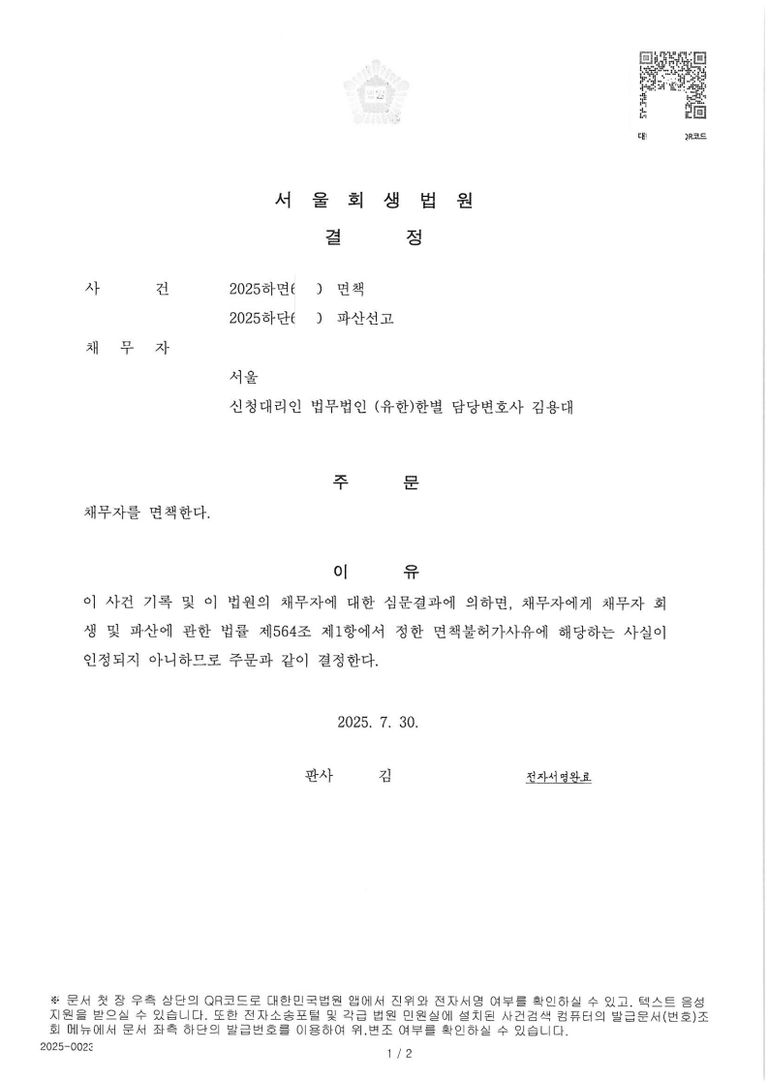 또한 별다른 문제가 없었기에 1차 집회에서 바로 면책결정을 받아, 신청부터 면책까지 총 4개월의 기간이 걸렸습니다.