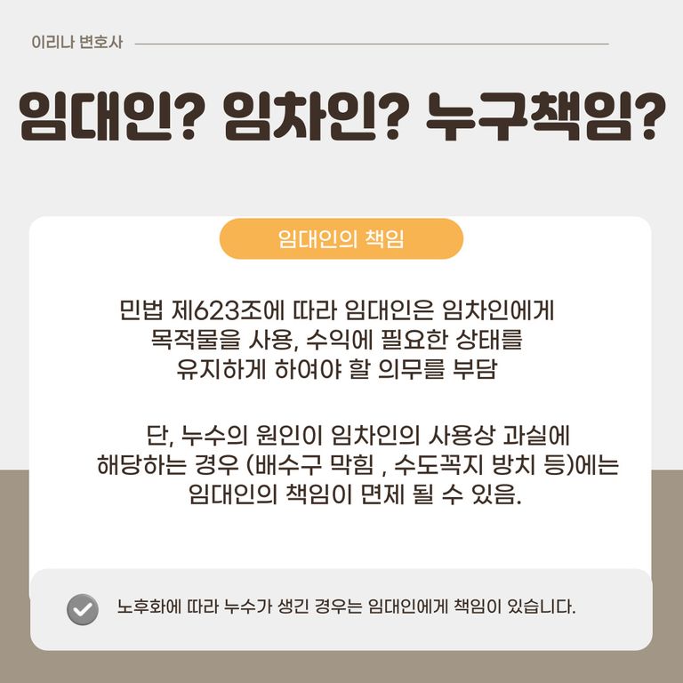 임차인의 과실이면 → 임차인이 책임( 기본적으로 임대인의 책임범위)