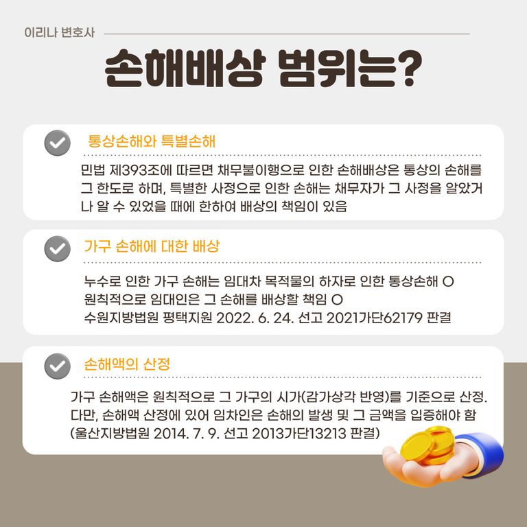 따라서 구체적인 사안에서 임대인의 손해배상책임 여부는 누수의 원인, 임대인과 임차인의 대응, 계약상 특약 등을 종합적으로 고려하여 판단해야 합니다.
