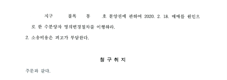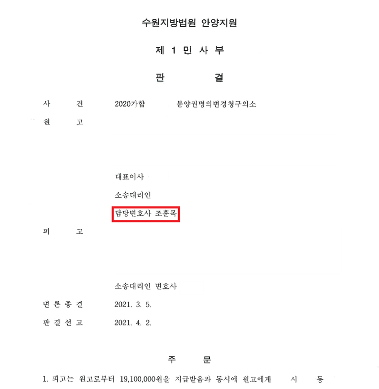사건을 담당한 수원지방법원 안양지원 재판부는 위 원고 주장을 전부 받아들여, "피고가 원고로부터 분양대금 잔액을 지급받음과 동시에 매매대상 분양권에 관한 수분양자 명의변경절차를 이행하라"는 판결을 내리고 사건을 종결하였습니다.