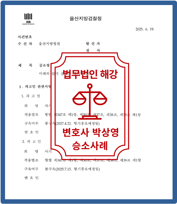 저희 법무법인 해강은 법리적인 검토를 통하여 의뢰인 상황에 맞춘 변호인 의견서 등 작성을 통하여 의뢰인을 위해 최선을 다하였고 이에 [불구속구공판]을 이끌어냈습니다.