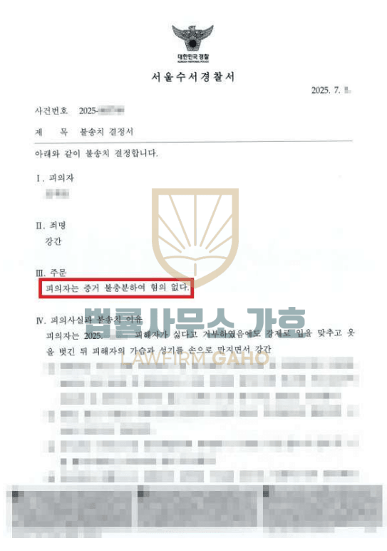 죄명 그 자체로 중범죄인데다가 고소인의 진술이 구체적이었기 때문에 방어가 쉽지 않은 사안이었으나, 사건 초기부터 사실관계 분석을 위해 수차례 [의뢰인과 미팅]을 거치고 성관계 당시는 물론 전후 사정에 대해 구체적인 진술을 위한 [피의자조사 전 시뮬레이션]을 진행한 뒤 경찰조사 참여를 성공적으로 마치고 이후 피해자 진술의 신빙성과 배치되는 객관적인 자료를 분석한 [변호인의견서 제출] 등 전방위적인 조력을 하였습니다.