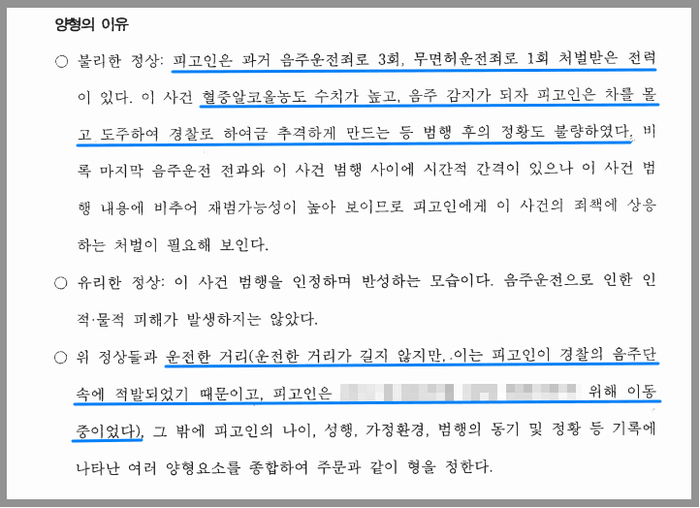 그러나 술에 취한 상태에서 운전을 하다가 사고를 냈거나, 단기간 내의 재범인 경우 또는 혈중알코올농도가 매우 높은 경우에는 집행유예가 아닌 실형이 선고될 수도 있습니다. 또한 이 사건과 같이 여러 정황에 비추어 재판부에서 죄질이 좋지 않다고 판단되는 때에도 실형이 선고될 수 있습니다.