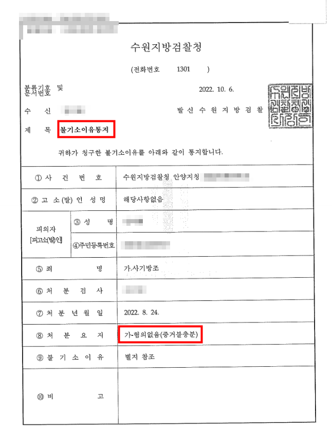 위와 같은 변호인의 주장을 받아들인 검찰은 불기소결정(혐의없음)을 하였습니다.