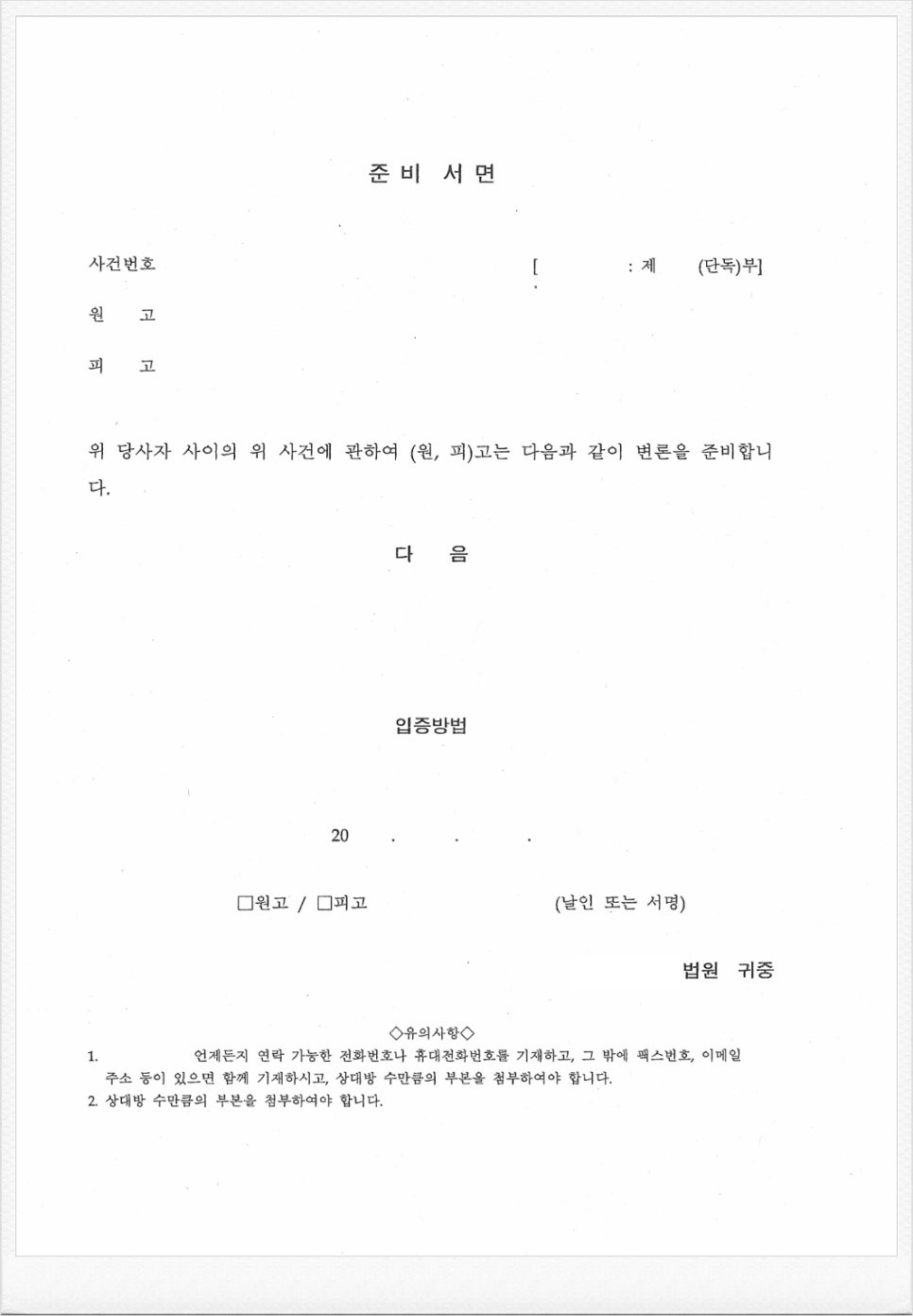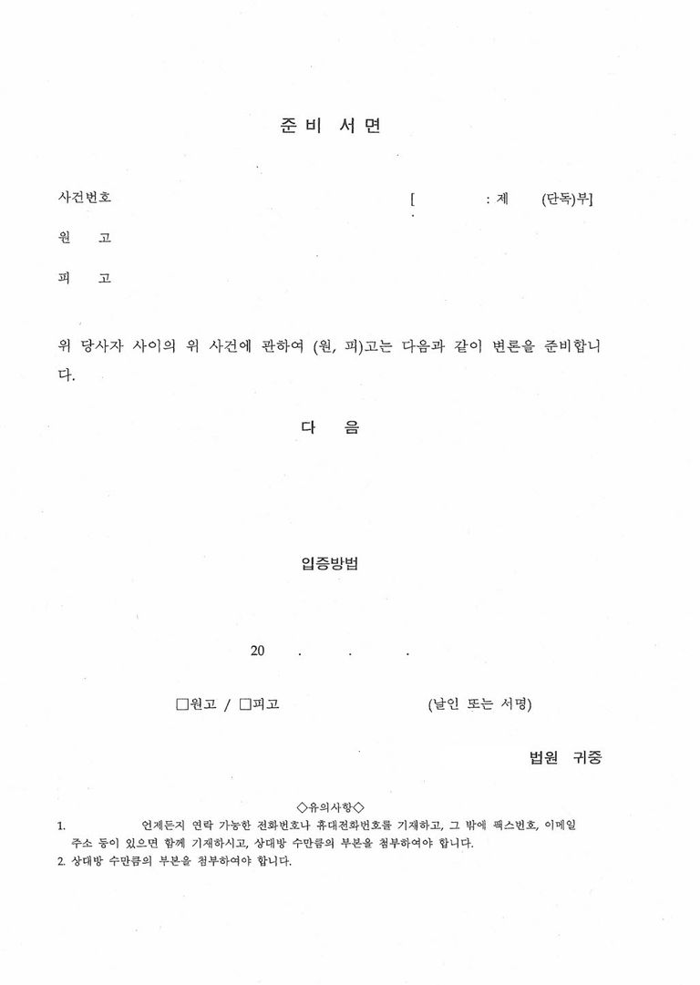 인지 불요 : 준비서면에는 소장과 달리 인지를 붙일 필요가 없습니다.
