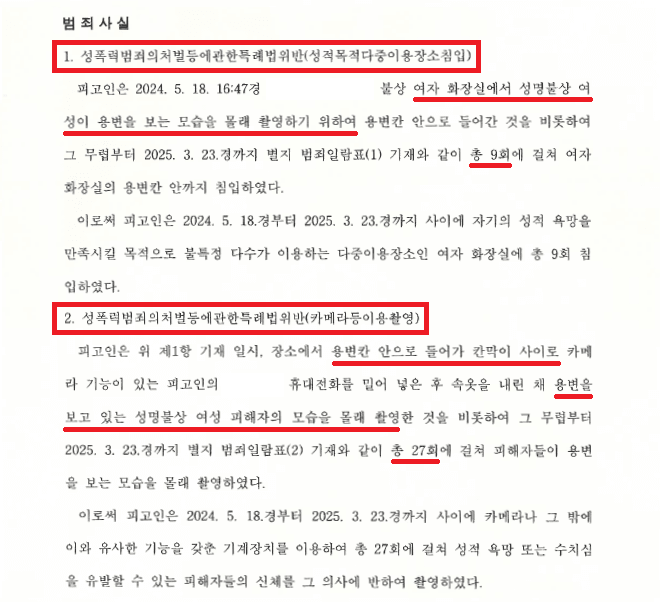A씨는 2024. 5. 18.경부터 2025. 3. 23.경까지 약 10개월 동안 9군데의 여자화장실에 들어가 용변칸 밑으로 휴대전화를 밀어 넣어 27명의 여성들이 용변을 보는 모습을 몰래 촬영하였다가 마지막 여성 피해자의 신고로 출동한 경찰들에 의해 현행범 체포되어 휴대전화를 압수당한 뒤 석방되었습니다.