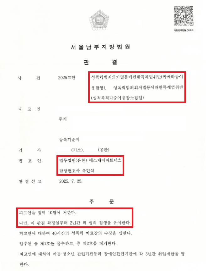 이러한 저의 조력을 바탕으로 A씨는 약 10개월 동안 9군데의 여자화장실에 들어가 27명의 여성들이 용변을 보는 모습을 몰래 촬영하여 죄질이 매우 나빴음에도 불구하고 집행유예의 선처를 받음으로써 일생일대의 위기에서 벗어날 수 있었습니다.