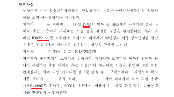A씨는 2023. 7. 7. 23:13경 트위터에서 '영상을 판매한다'라는 내용의 키워드와 함께 라인 아이디 '08ㅅㅇ'을 게시하고 있는 판매자의 계정을 발견하고 라인으로 연락하여 판매자가 알려준 바와 같이 토스 익명계좌 'heobal'로 2,000원, 4,000원을 송금하여 여성이 나체로 춤을 추는 동영상 2개를 구매하였습니다.