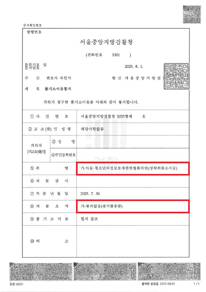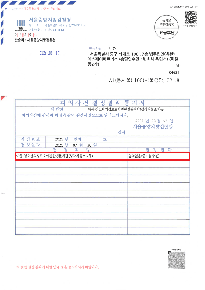 이러한 저의 조력을 바탕으로 A씨는 동일 사건의 제가 선임하지 않은 다른 일부 피의자들은 혐의가 인정되고 있음에도 불구하고 '혐의없음(증거불충분)' 처분을 받음으로써 억울하게 성범죄자가 될 위기에서 벗어날 수 있었습니다.
