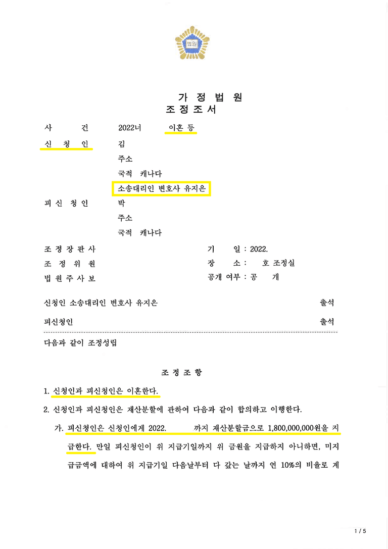 남편 또한 캐나다 국적이라 해외송달을 하게 되면 오래 걸릴 수 있는 사안이었으나 조정신청서를 시댁으로 송달시키고, 남편을 설득하여 4개월 만에 재산분할로 약 22억 이상을 받아오며 성공적으로 마무리가 된 사안입니다.