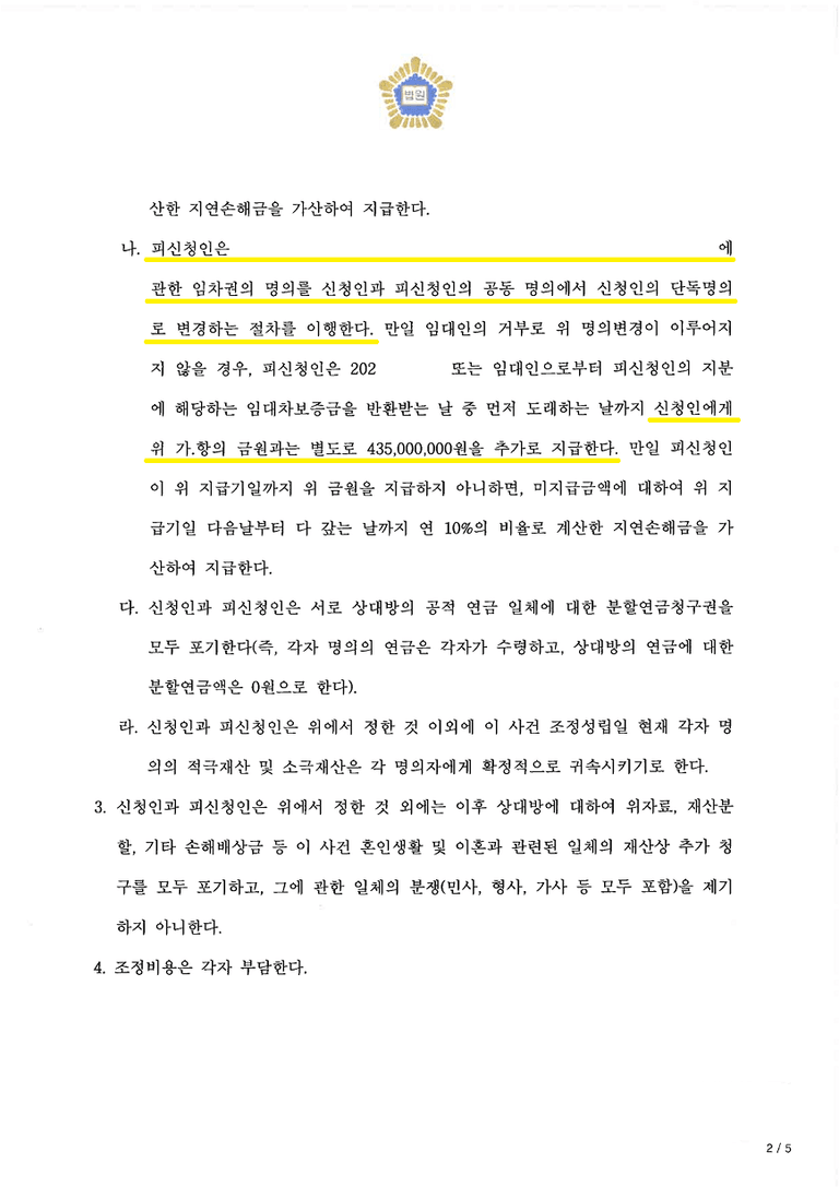 또한 혹시라도 임대인이 거부할 경우를 대비하여 명의변경이 어려울 경우 임차보증금 4억 3,500만 원을 추가로 지급받기로 하였고, 결국 남편을 잘 설득하여 2회 만에 재산분할로 22억 이상을 받아올 수 있었습니다.