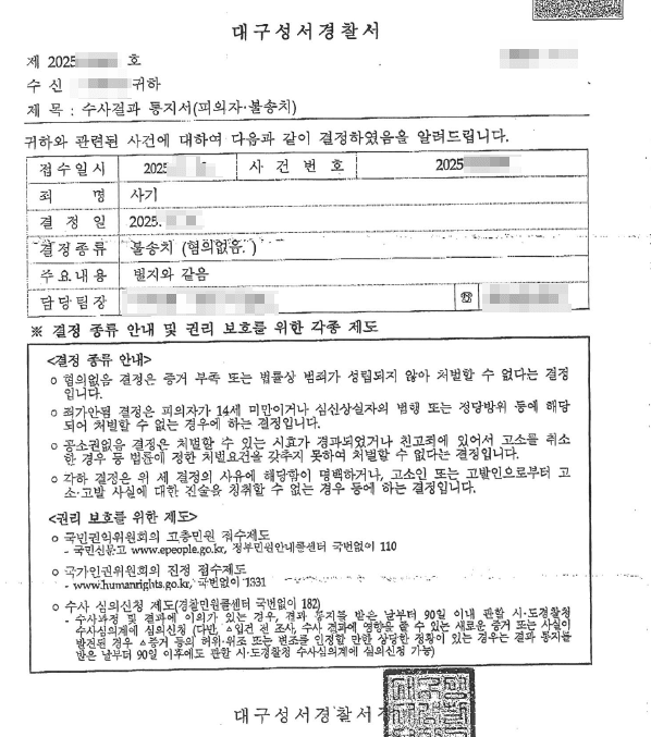 수개월에 걸친 치열한 법적 다툼 끝에, 경찰은 마침내 의뢰인 A씨의 사기 혐의에 대해 '불송치(혐의없음-증거불충분)' 결정을 내렸습니다.