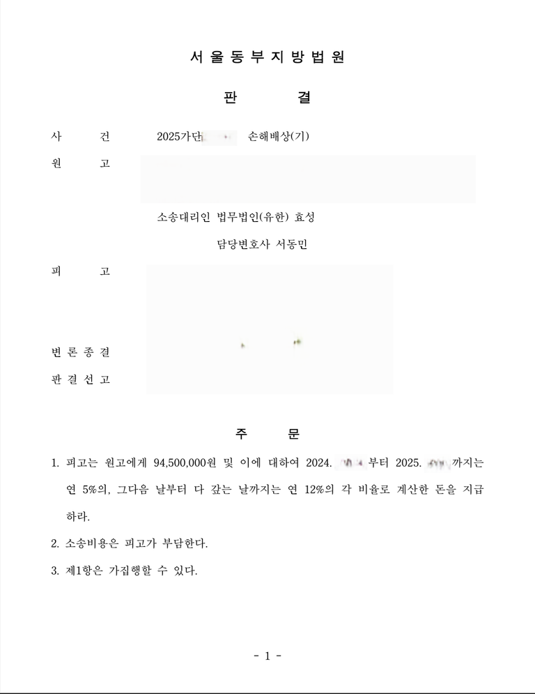 저는 즉각 입건된 가해자를 상대로 민사소송 불법행위 손배청구를 하였고 법원은 원고 승소 판결을 선고하여 의뢰인은 피해액을 배상받았습니다.