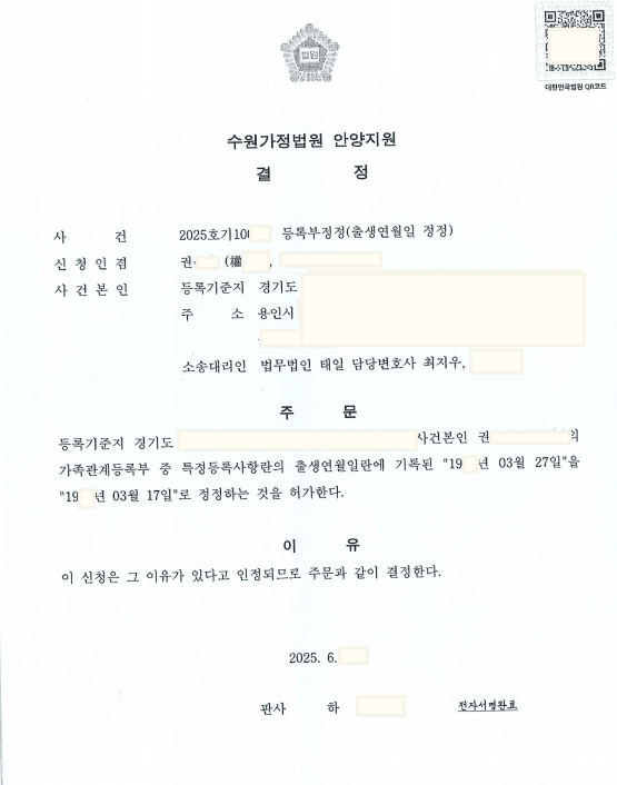 '출생연월일' 정정 성공 사례를 소개해 드렸습니다.