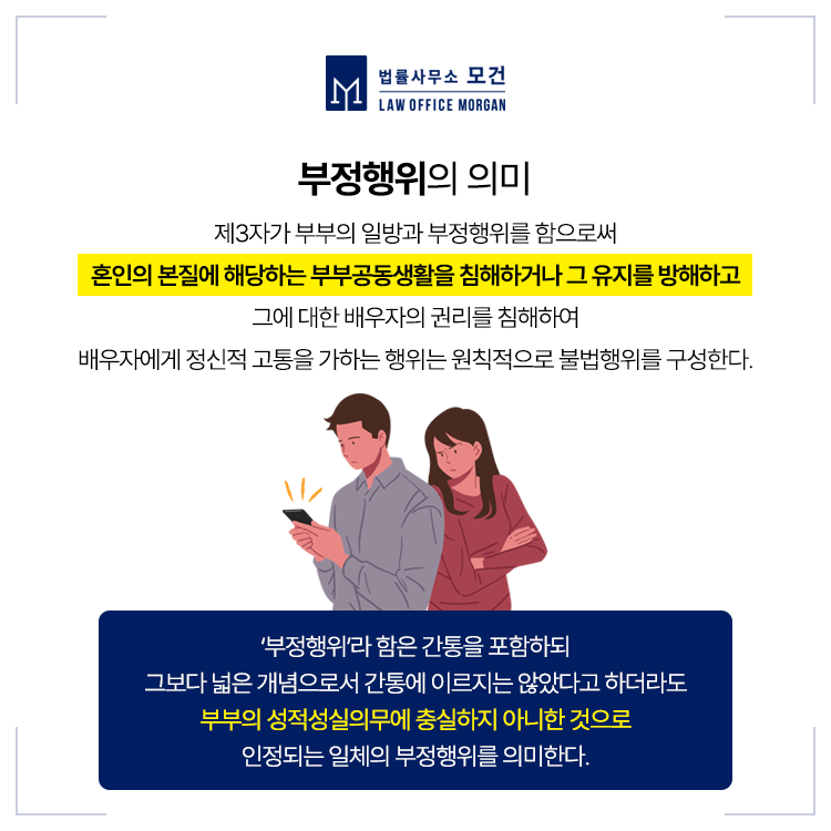 상간녀소송을 기각시키는 일은 결코 쉽지 않습니다. 남녀사이의 친분관계를 모두 외도라 단정할 수는 없으나, 법원이 인정하는 '부정행위'가 매우 광범위하기 때문입니다.