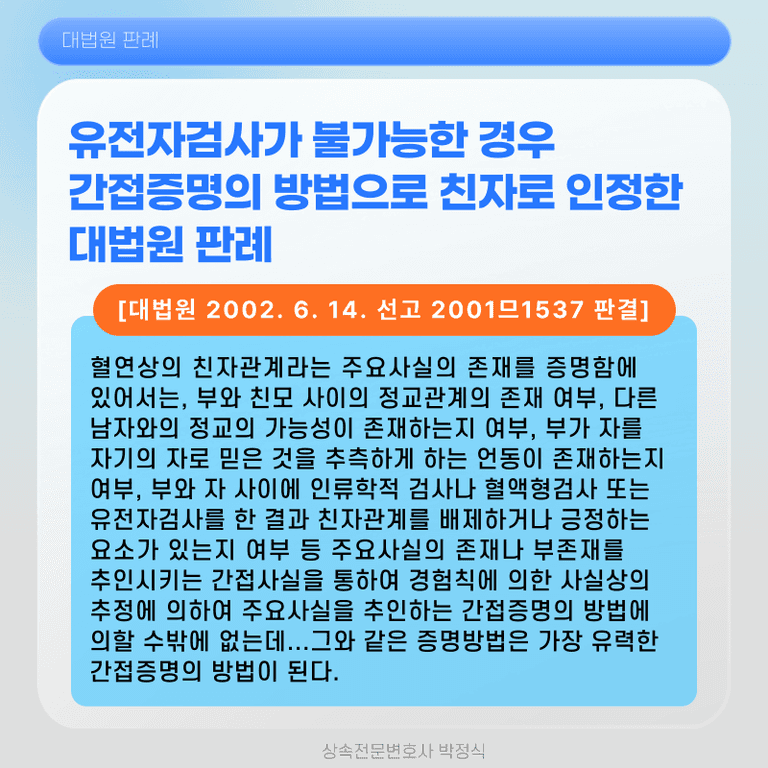 “혈연상의 친자관계라는 주요사실의 존재를 증명함에 있어서는, 부와 친모 사이의 정교관계의 존재 여부, 다른 남자와의 정교의 가능성이 존재하는지 여부, 부가 자를 자기의 자로 믿은 것을 추측하게 하는 언동이 존재하는지 여부, 부와 자 사이에 인류학적 검사나 혈액형검사 또는 유전자검사를 한 결과 친자관계를 배제하거나 긍정하는 요소가 있는지 여부 등 주요사실의 존재나 부존재를 추인시키는 간접사실을 통하여 경험칙에 의한 사실상의 추정에 의하여 주요사실을 추인하는 간접증명의 방법에 의할 수밖에 없는데, 여기에서 혈액형검사나 유전자검사 등 과학적 증명방법이 그 전제로 하는 사실이 모두 진실임이 증명되고 그 추론의 방법이 과학적으로 정당하여 오류의 가능성이 전무하거나 무시할 정도로 극소한 것으로 인정되는 경우라면, 그와 같은 증명 방법은 가장 유력한 간접증명의 방법이 된다고 할 것이다”