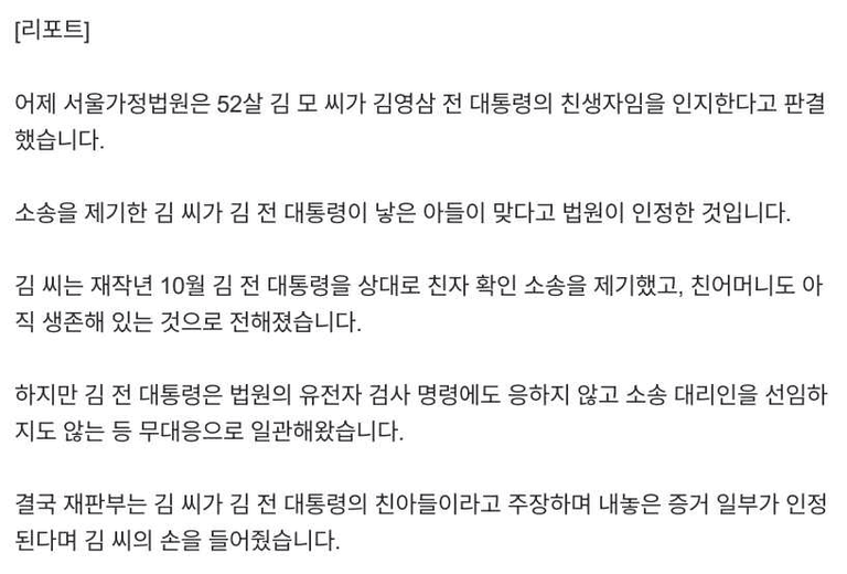 예전에 김영삼대통령의 경우 서울가정법원에 친생자 인지청구소송이 제기되었을때 유전자 검사에 응하지 않자, 간접증명의 방법으로 판결한 예가 있습니다. 아래 당시 신문기사를 보면 유전자검사를 하고도 인지가 되는 경우가 있음을 알수 있습니다.