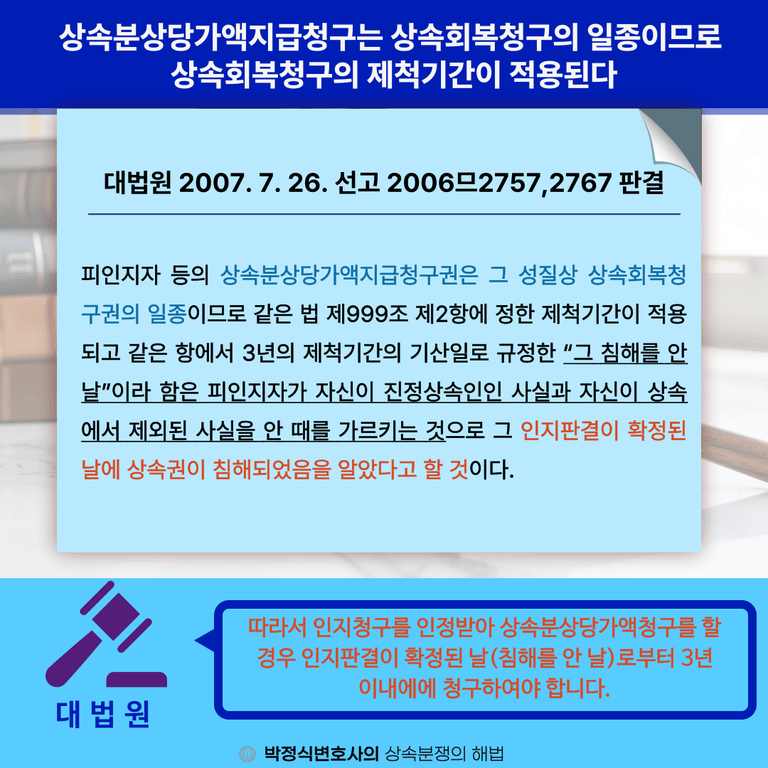 ㅇ다만 위와 같은 3년의 제척기간의 기산일로 규정한 “그 침해를 안날”이라 함은 피인지자가 자신이 진정상속인인 사실과 자신이 상속에서 제외된 사실을 안 때를 가르키는 것으로 그 '인지판결이 확정'된 날에 상속권이 침해되었음을 알았다고 보는 것입니다.