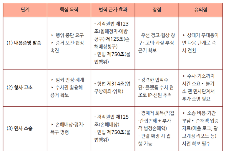 허위 저작권 신고는 ▲계정 삭제·수익 차단, ▲콘텐츠 영구 접속 불능, ▲브랜드 평판 손상 등 다층적 피해를 초래합니다. 하나의 절차만으로는 즉각적인 중단과 실질적 배상을 동시에 확보하기 어렵기 때문에, 내용증명 → 형사 고소 → 민사 소송을 단계적·병행적으로 활용하는 복합 전략이 효과적입니다.