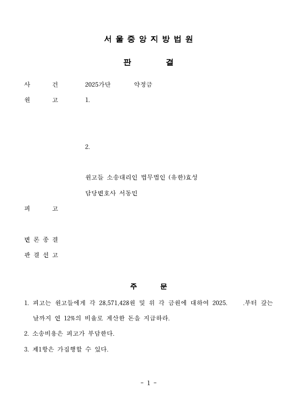저는 즉각 민사소송 약정금청구를 하였고 법원은 원고 승소 판결을 선고하여 의뢰인들은 약정금을 지급받았습니다.