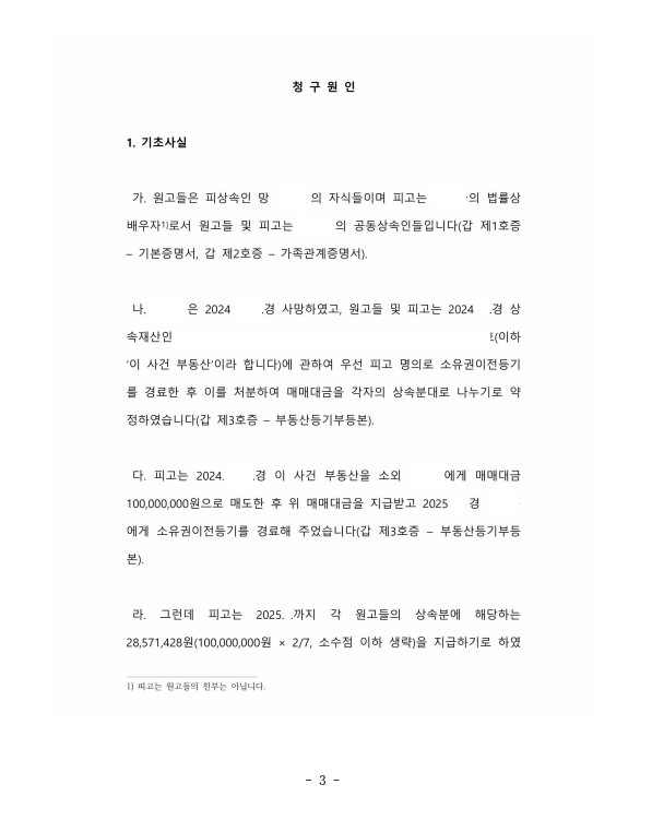 의뢰인들과 피고는 공동상속인 관계인데 피고는 상속재산을 처분하여 그 매매대금을 상속분에 따라 분할하기로 합의하고 상속재산을 처분하여 매매대금을 취득하였는데 약속과 달리 약정금을 지급하지 않아 의뢰인들은 저를 찾아오셨습니다.