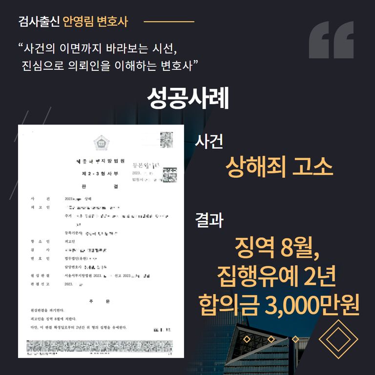 이에 저희는 의뢰인을 대리하여 즉시 상해죄 고소를 진행하였으며,