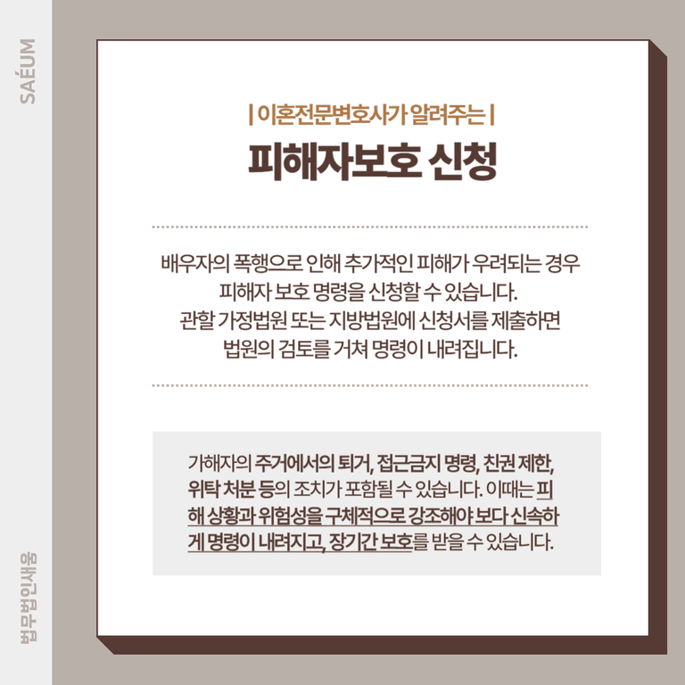 이미 여러 차례 가정폭력이 발생한 상황이었기에, 이혼 소송 과정에서도 추가적인 가해 행위가 재발할 우려가 높았습니다. 이에 법무법인 새움은 피해자 보호 명령 제도를 활용해 A씨가 추가적인 피해를 입지 않도록 대응했습니다.