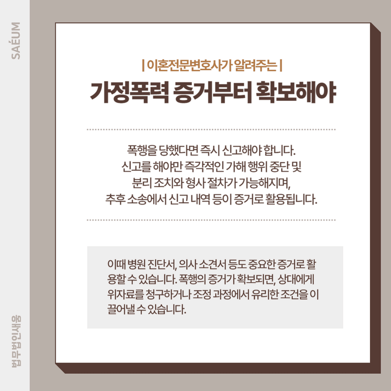 이혼소송 진행 여부와 관계없이, 폭행을 당했다면 즉시 경찰에 신고해야 합니다. 신고를 통해 즉각적인 가해 행위 중단은 물론, 분리 조치와 형사 절차가 가능해지며, 이후 진행될 이혼소송에서도 신고 내역, 보호 명령, 처벌 결과 등이 증거로 활용될 수 있습니다. 또한, 병원 진단서, 의사 소견서 등도 중요한 자료가 됩니다.
