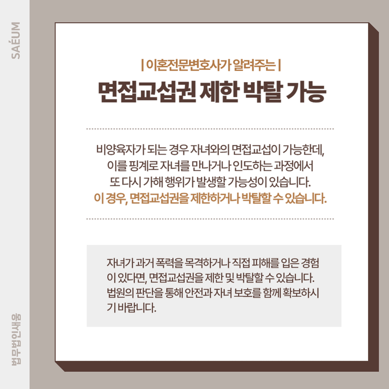 이런 경우, 자녀가 과거의 폭력을 목격하거나 직접 피해를 입은 경험이 있다면, 면접교섭권을 제한하거나 박탈하는 것이 가능합니다. 적극적으로 법원의 판단을 구하여 자녀 보호와 본인의 안전을 함께 확보할 수 있습니다.
