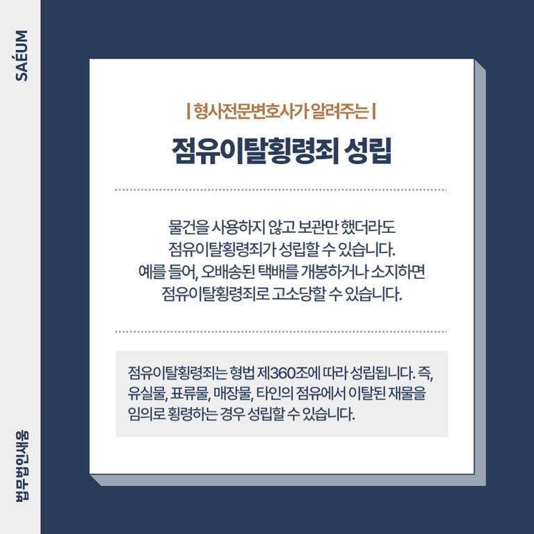 택배의 경우도 마찬가지입니다. 잘못 배송된 택배임을 알면서도 이를 개봉하거나 소지했다면, 점유이탈횡령죄로 고소당할 수 있습니다.