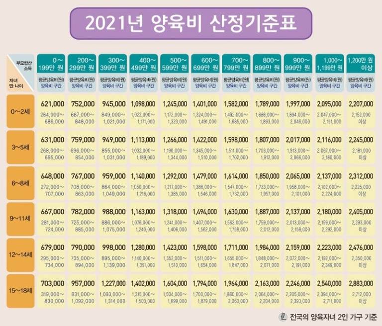1) 산정기준표의 표준양육비는 ‘양육자녀가 2인인 4인 가구’를 기준으로 한 ‘자녀 1인당 평균 양육비’입니다.