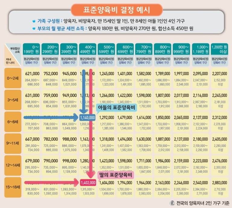 첫째인 딸의 경우, 나이가 만 15세이고 부모의 합산소득이 450만 원이니, 세로축의 ‘자녀 나이 15~18세 구간’과 가로축의 부모합산소득 400만 원~499만 원’이 교차하는 구간을 찾아보면 표준양육비가 1,402,000원임을 알 수 있습니다.