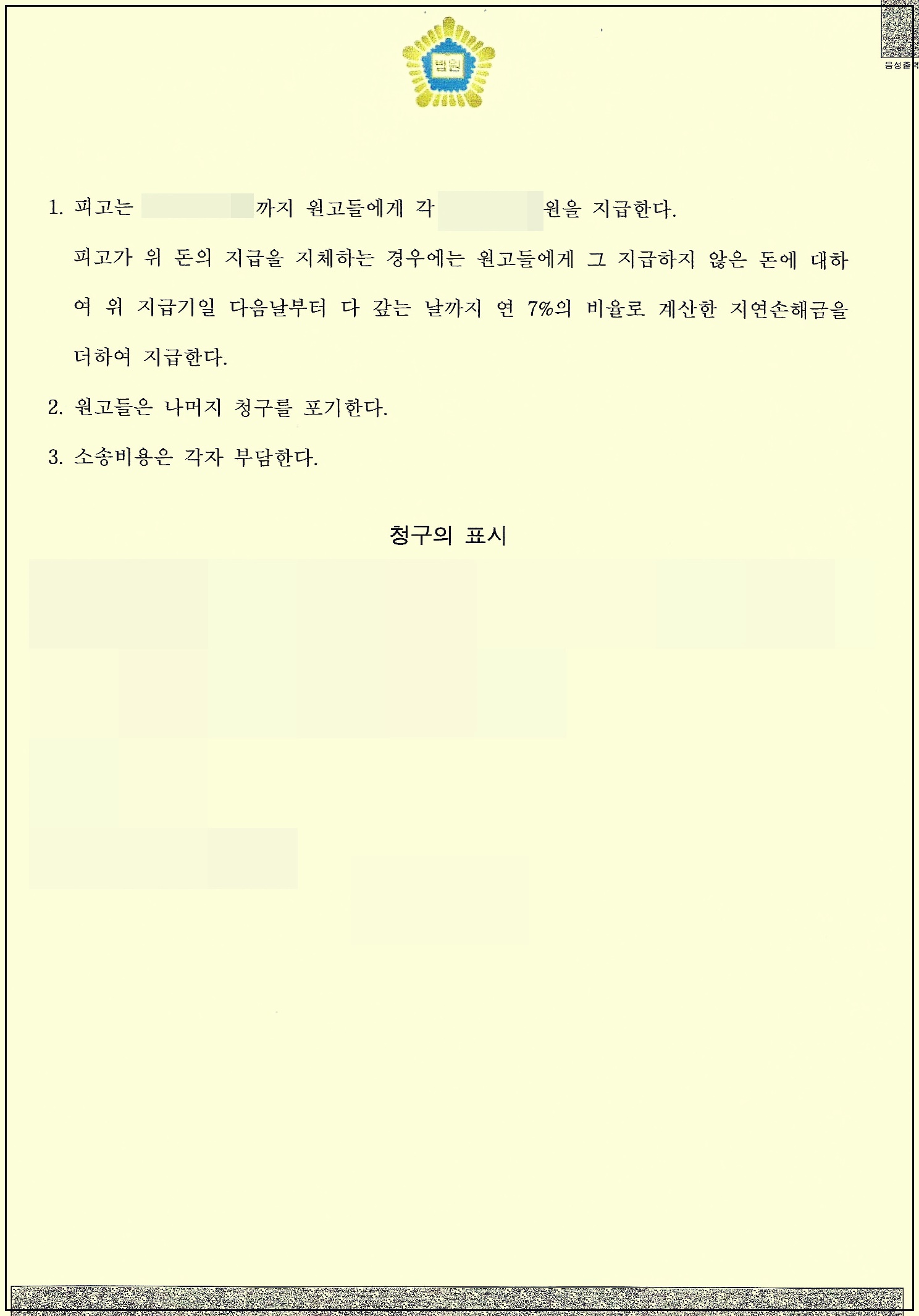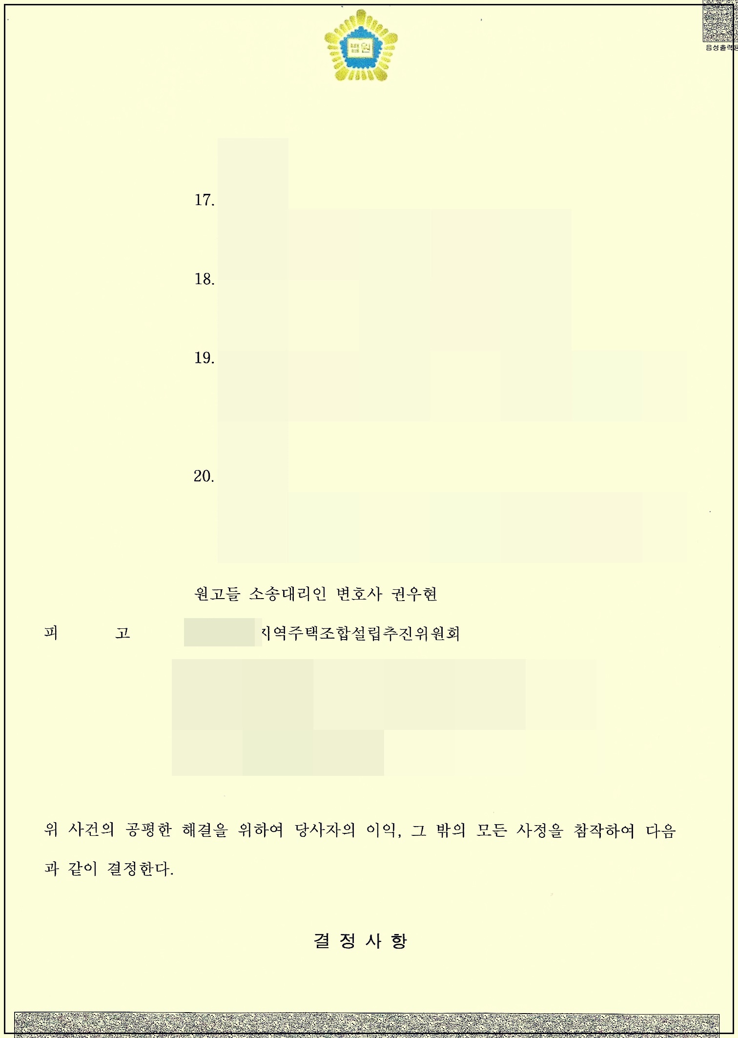 6. 아래의 사례는 모 지역주택조합설립추진위원회의 가입계약자들이 조합원분담금과 용역비에 관하여 반환을 소송으로 구하였다가 판결 선고만 남겨둔 상황에서 조합설립추진위원회의 합의제의에 일부 양보하여 화해권고결정 방식으로 합의를 본 집단 소송 사안으로, 소송을 대리한 변호사의 입장에서는 “절대 지역주택조합은 잘 알아 보고가 아니라 아예 가입을 하면 안 되겠다”는 개인적인 소감을 남겨 봅니다.