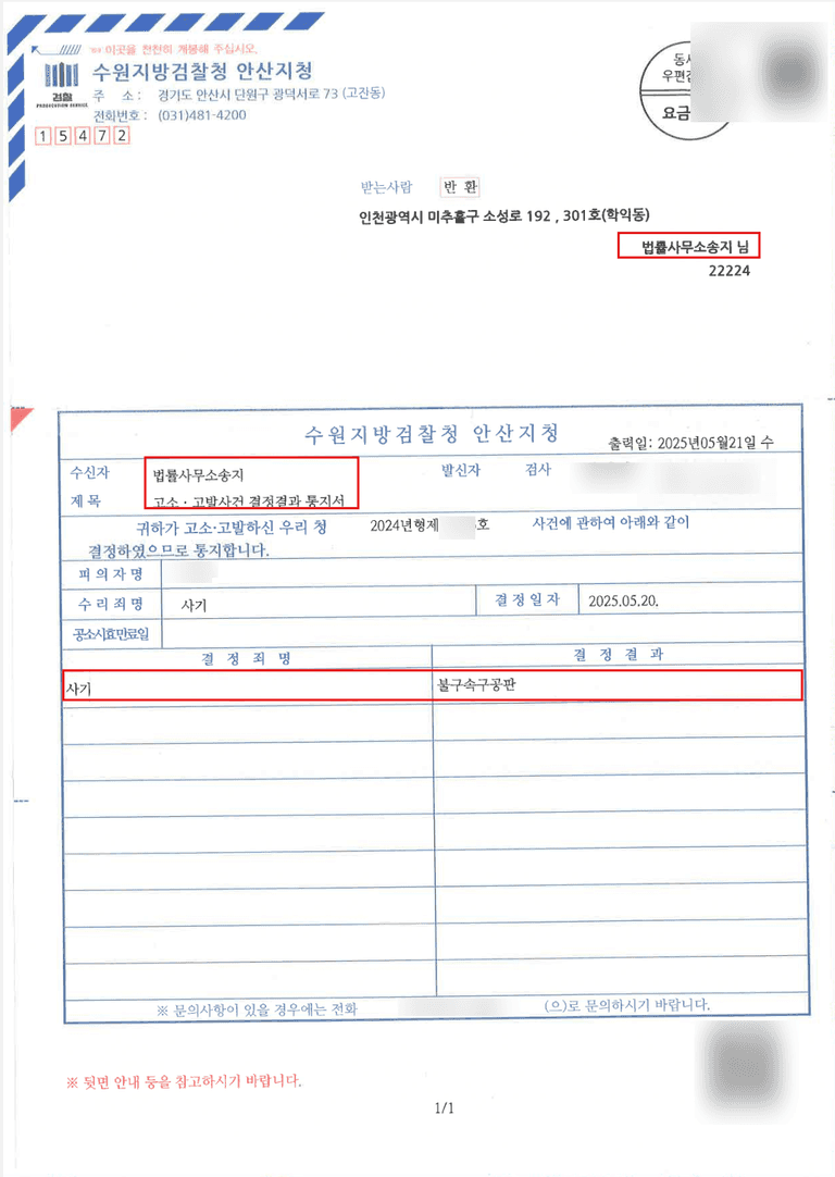 그 결과 물품대금에 대하여 피의자의 사기고의가 인정되었고, 피의자는 기소되었습니다.