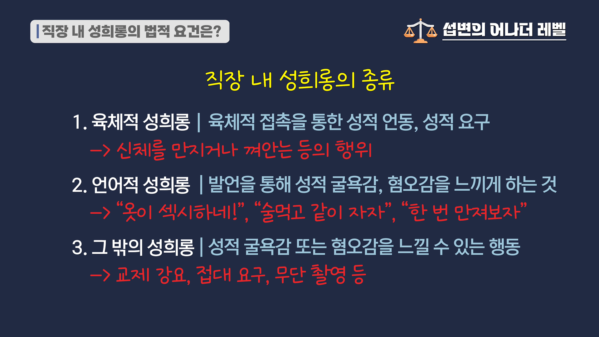 이 중 특히 성적 언동 여부가 실무에서 가장 중요한 기준이 됩니다.