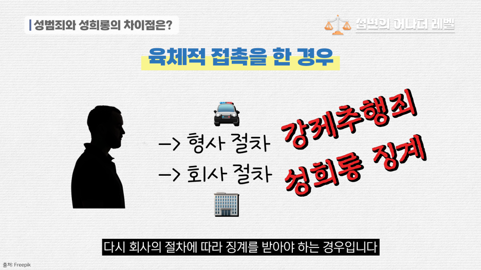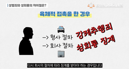 강제추행죄(형사처벌)와 직장 내 성희롱(징계 등)이 함께 적용될 수 있음.