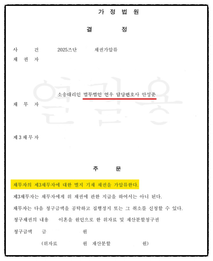 오늘은 이혼을 앞두고 위자료 및 재산분할을 목적으로 상대방 명의의 재산에 대해 가압류를 신청하여 인용된 사례를 소개해드리고자 합니다. 의뢰인의 배우자는 의뢰인으로부터 곧 이혼 소송이 제기될 것을 알게 되자 자기 명의로 된 재산을 처분하려고 하는 정황이 포착되었는데요, 이에 본 변호사가 의뢰인을 대리해 신속히 가압류를 하여 재산이 처분되는 것을 막은 사건입니다. 사연인즉 이렇습니다.