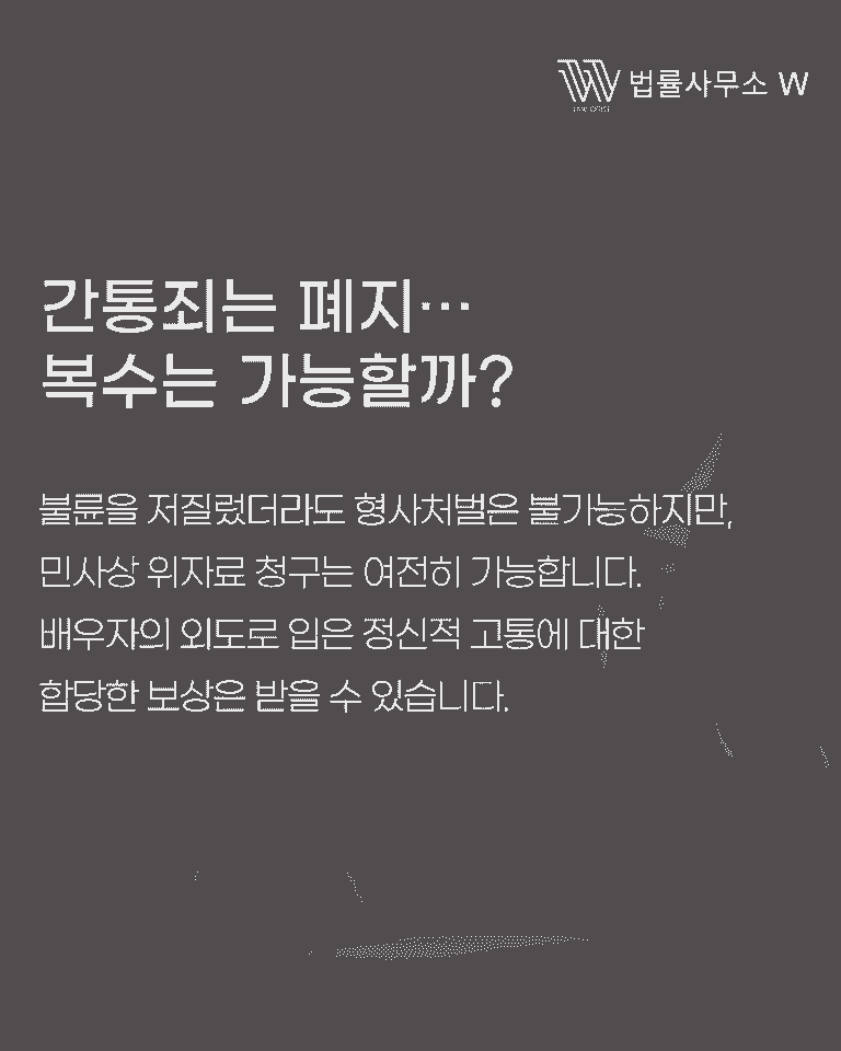 배우자의 외도로 인해 심각한 정신적 고통을 겪었음에도, 간통죄가 폐지된 지금, 형사처벌이라는 방식으로 응징하는 것은 더 이상 불가능해졌습니다. 그렇다면 법적으로 복수할 수 있는 방법은 전혀 없는 걸까요? 아닙니다. 민사상 위자료 청구는 여전히 가능하며, 불륜의 피해를 입은 당사자가 감내한 고통을 기준으로 일정 금액의 위자료를 청구할 수 있습니다.