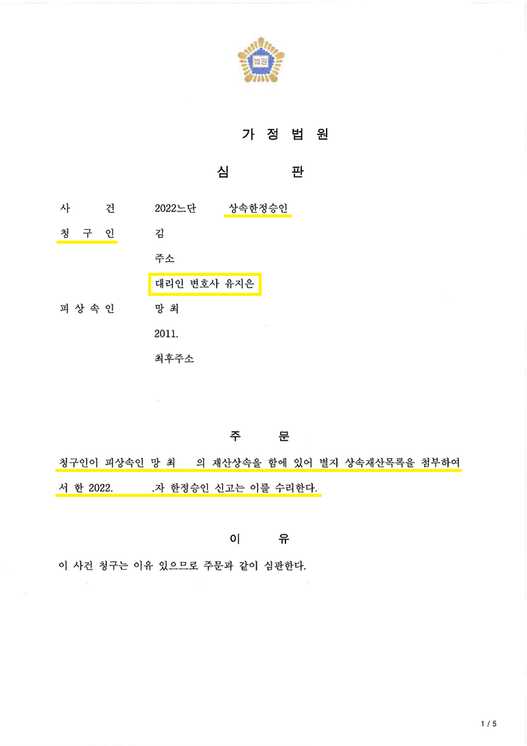 의뢰인은 망인의 채무를 떠안게될까봐 크게 걱정하고 있었는데 특별한정승인이 인용됨으로써 재산을 안전하게 지킬 수 있었던 사안입니다.