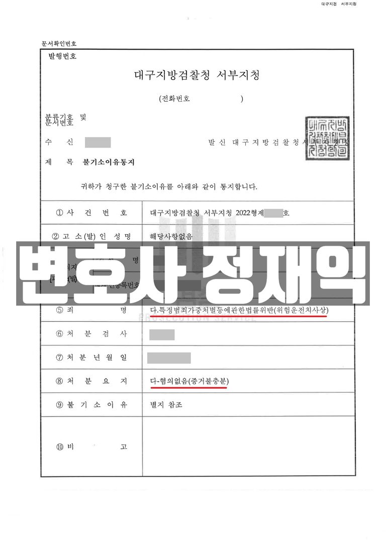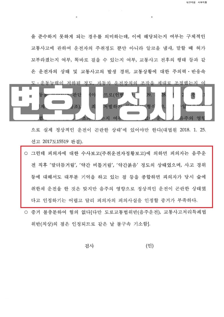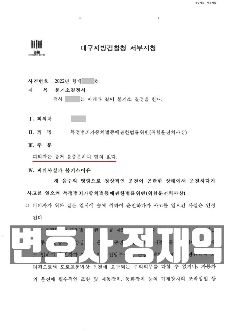 검사는 정재익 변호사의 의견을 수용하여 특가법위반에 대해서는 무혐의 처분을 내렸고, K씨에 대해 단순 음주운전으로만 기소하였습니다.