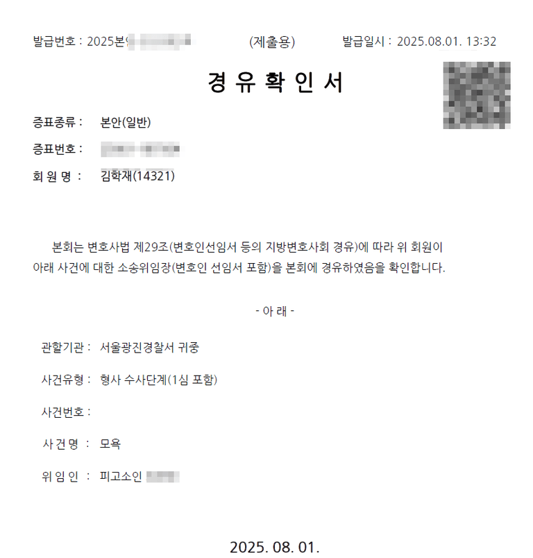 [의뢰현황] 2025년 8월 1일 최**님 모욕죄 사건 위임