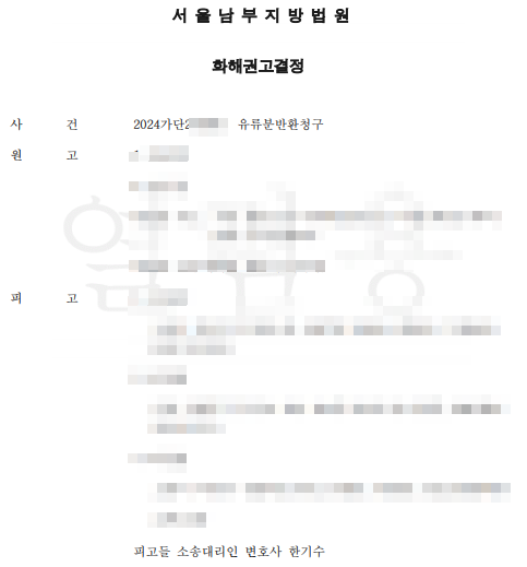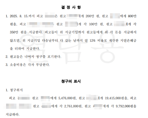 그 결과 법원은 판결보다는 화해권고결정을 하면서 원고들이 청구한 금액의 약 1/3만 인정하였습니다. 이에 대해 원피고들 모두 이의를 제기하지 않아 확정되었습니다.