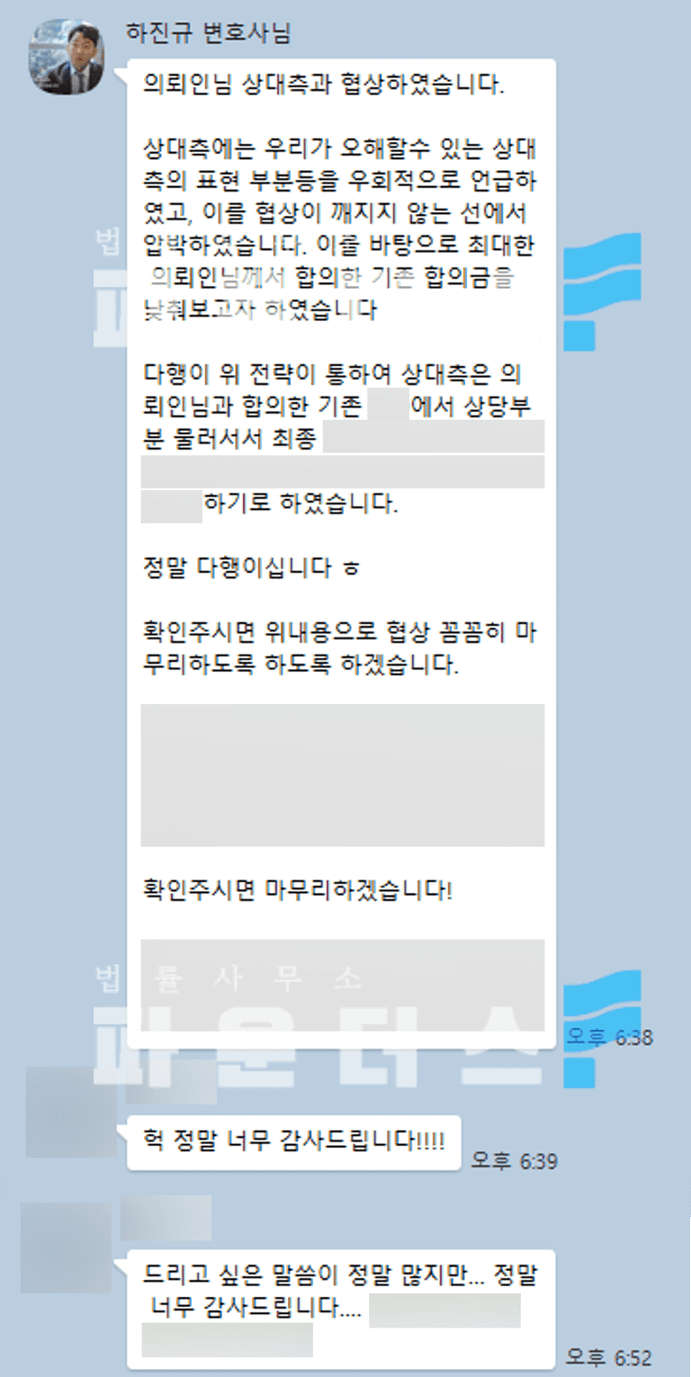 결과적으로 의뢰인은 상대 측과 원만한 합의에 이를 수 있었고 합의서 작성 등으로 고소 전 사건을 마무리 지을 수 있었습니다.