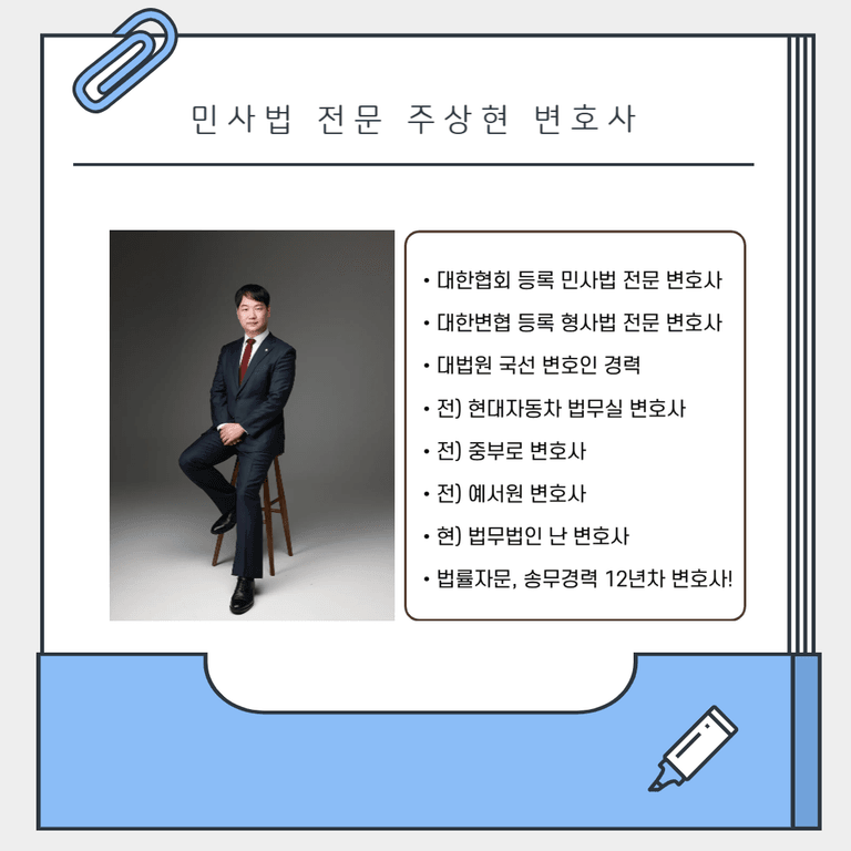주상현 변호사는 민사법 전문 변호사입니다. 민사소송 대응과 관련하여 사건 상담, 수임 등을 원하시면 언제라도 연락 주시기 바랍니다.