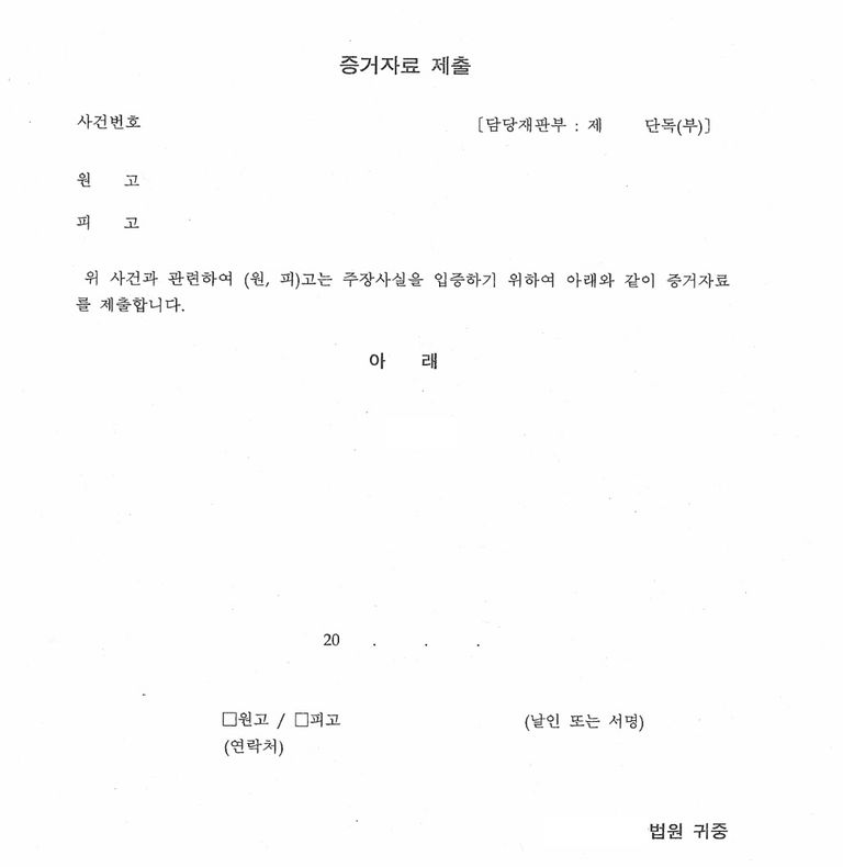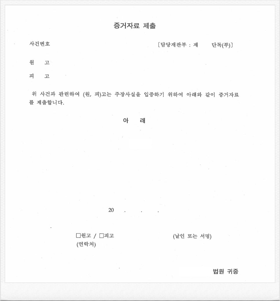 증거제출서는 법원에 어떤 증거를 법원에 제출하는지 알리는 문서입니다. 쉽게 말해 제출된 증거 목록을 정리한 문서로 볼 수 있습니다.