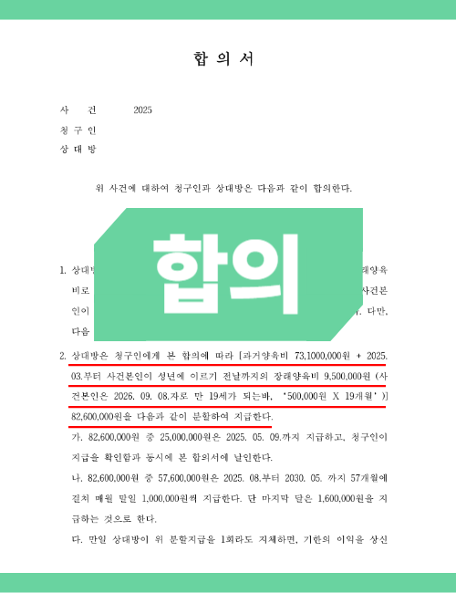 처음 B씨는 과거 양육비를 지급할 수 없다고 주장했습니다. 그러나 과거 양육비를 지급해야 할 법적 의무가 있다는 점을 고지하고, 합의에 응할 경우 분할 지급을 할 수 있도록 하겠으나, 만일 소송으로 진행할 경우 분할 지급이 불가능해져 거액의 양육비 미지급금을 한 번에 지급해야 하는 등 어려움이 생길 수 있음을 설명했습니다.