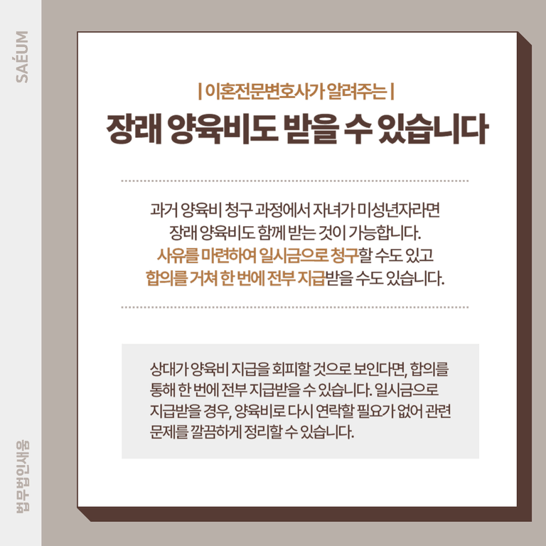 과거 양육비를 청구하는 과정에서 아직 자녀가 미성년자라면, 미래에 대한 양육비도 함께 받는 것이 가능합니다. 합당한 사유를 마련하여 일시금으로 청구할 수도 있고, 합의를 거쳐 한 번에 전부 지급받을 수도 있습니다.