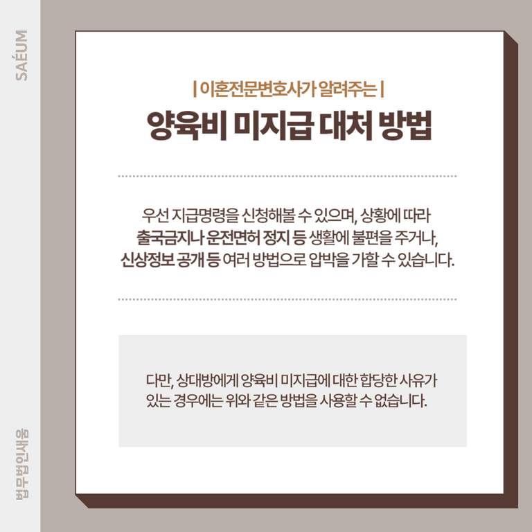 다만, 상대방에게 양육비 미지급에 대한 합당한 사유가 있는 경우에는 위와 같은 방법을 사용할 수 없습니다. 따라서 별다른 사유 없이 지급하지 않았다는 점을 입증하여, 압박 수단을 사용할 수 있도록 해야 합니다.